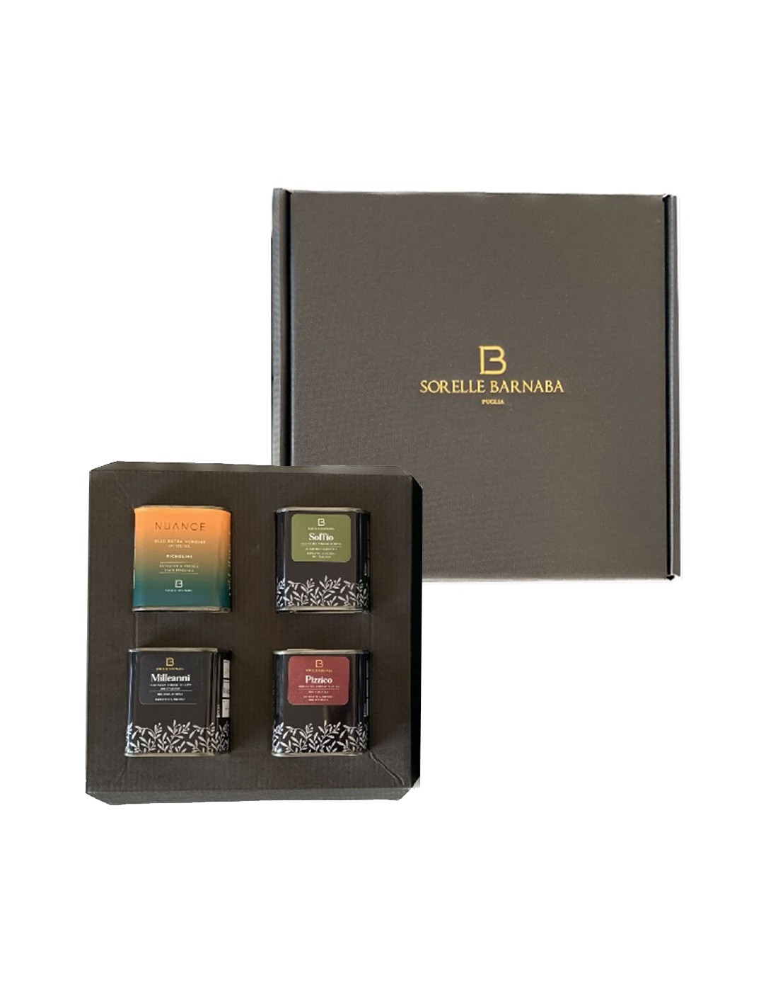 It is the ideal gift to taste all the flavors of Apulian evo oil! Three monocultivars, Nuance, Milleanni, Pizzico and the Soffio blend. Start thinking about who to gift this beautiful box to.